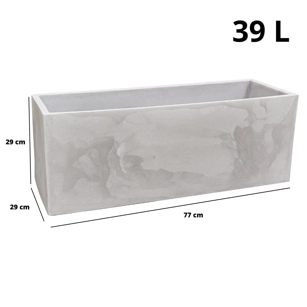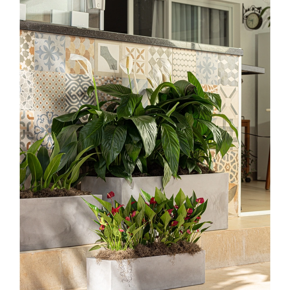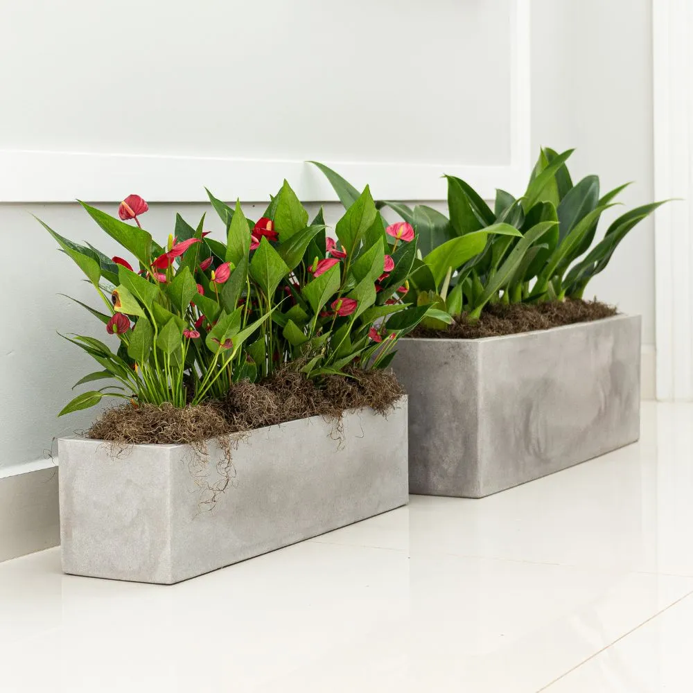 As Floreiras Flat na cor cimento queimado (cinza claro), têm como principal característica o seu formato de cantos retos, simples com muita elegância, o que faz a linha Flat uma ótima escolha para sua loja! As floreiras são projetadas para serem usadas como cachepôs, não sendo indicado o plantio direto.