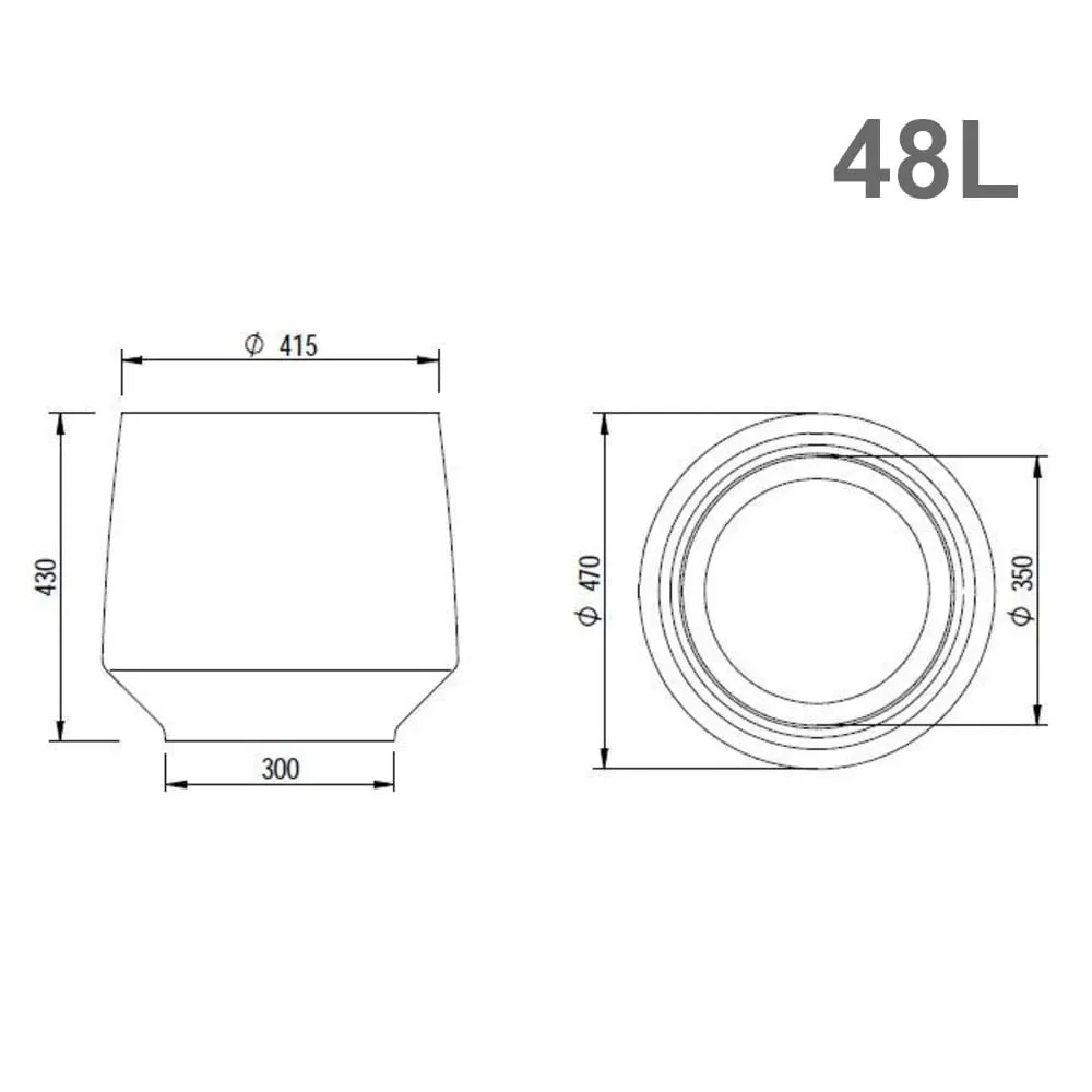 Boca: 35 cm; Base: 30 cm; Volume: 48 litros