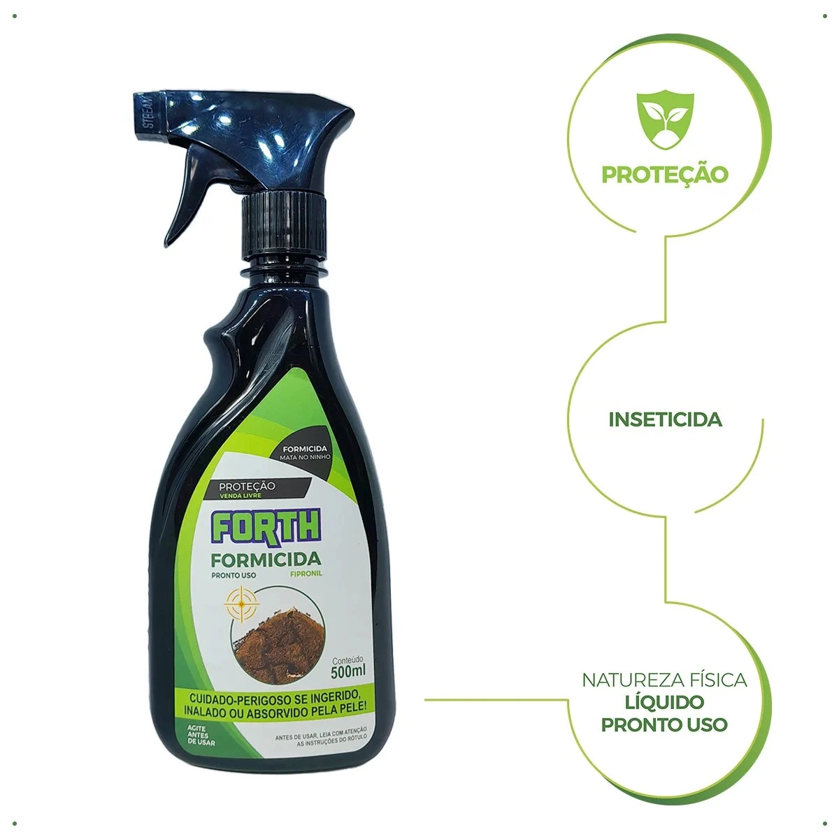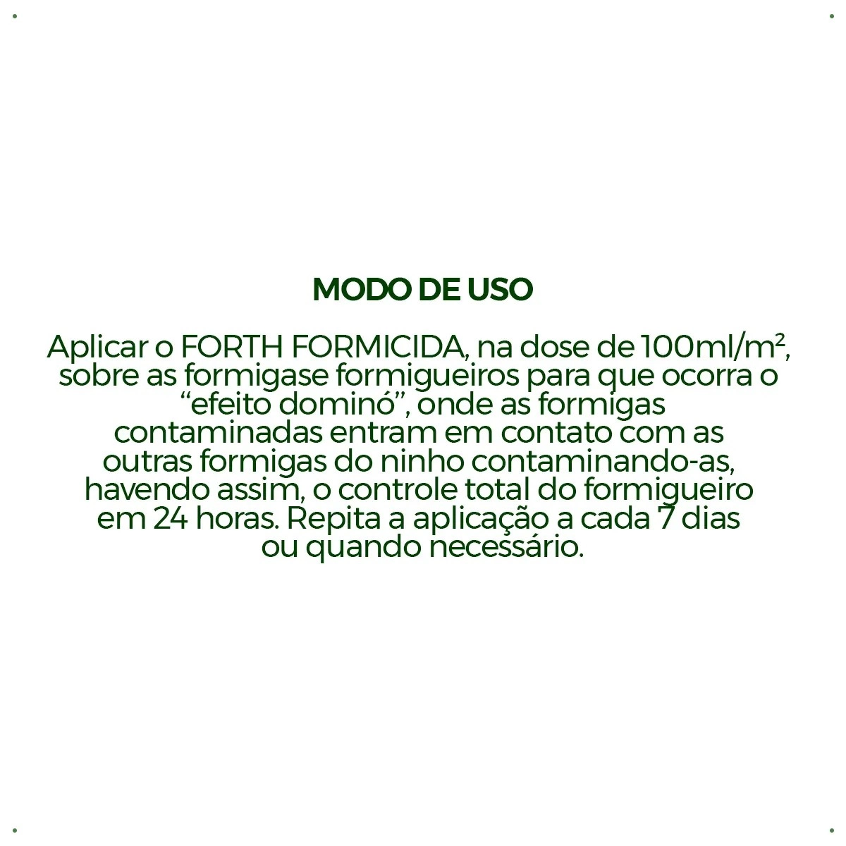 Aplicar o FORTH FORMICIDA, na dose de 100ml/m², sobre as formigas e formigueiros para que ocorra o efeito dominó’’, onde as formigas contaminadas entram em contato com as outras formigas do ninho contaminando-as, havendo assim, o controle total do formigueiro em 24 horas. Repita a aplicação a cada 7 dias ou quando necessário.