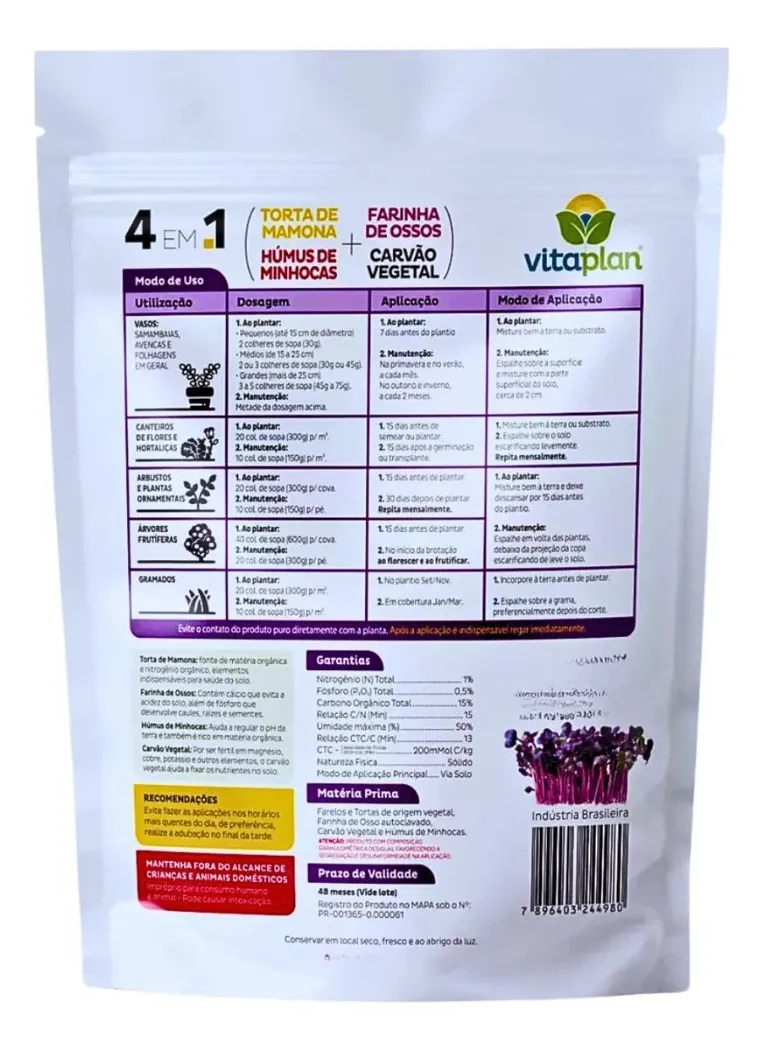 Modo de aplicação sugerido: Em vasos: medir colheres conforme tamanho do vaso; preparar o solo alguns dias antes do plantio. Em canteiros: dosagem por metro quadrado, misturar bem ao solo antes de semear ou plantar.