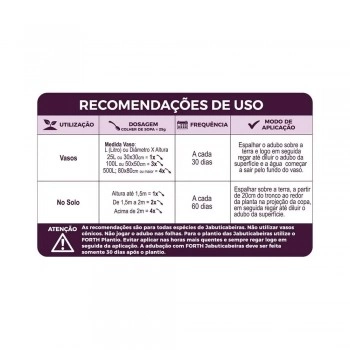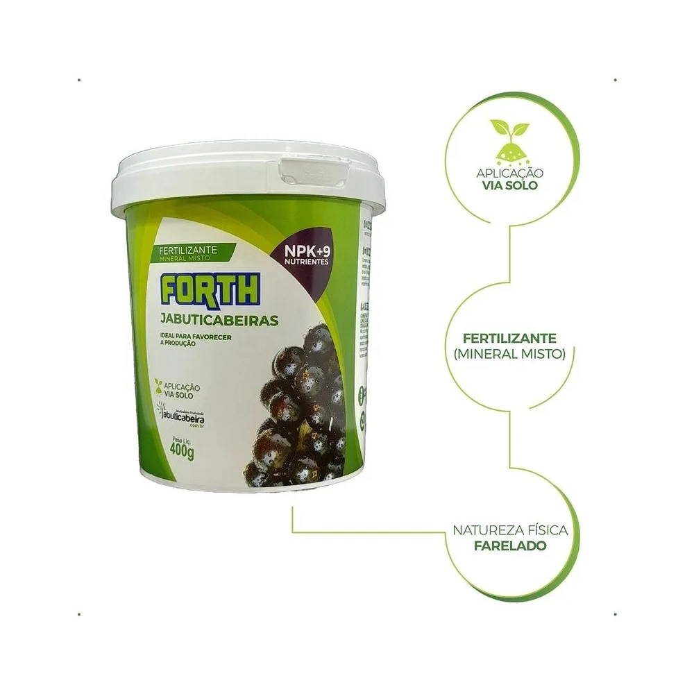 Se você ama suas jabuticabeiras, este adubo é aquele cuidado especial que faz toda a diferença. O Forth Jabuticabeiras foi desenvolvido especialmente para atender às necessidades nutricionais dessa espécie, ajudando desde as mudinhas até as plantas já formadas.Com ele, sua jabuticabeira ganha mais vigor, folhas verdes e sadias, além de uma frutificação intensaé praticamente uma festa de jabuticabas no seu quintal! Mesmo quem não entende muito de jardinagem consegue usar com facilidade e garantir resultados incríveis.Ideal para quem deseja um jardim produtivo, bonito e cheio do doce sabor da jabuticaba direto da planta.